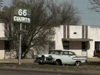 April 13, 1996 - We go in search of the mythical Route 66. I don't see the route marked on any map - only interstate 40. Turns out route 66 died out a long time ago when the interstate was built and it is really hard to follow the old route 66. We drop off at the Route 66 and Barbed wire museum in McLean Texas. With our Route 66 pamphlet in hand, we seek the mother road. As you drive along you can see the long abandoned bones of hotels and gas stations. It is so windy today that we stop around 4:00PM and camp. Winds are 30-40MPH with tumbleweeds blowing by.